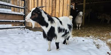 Smokey was one of the first crop of kids to be born on Crooked Horn farm. She is a trooper and has survived several bouts of Meningeal Worm. She was a very devoted and caring mother to "Kindling" before her condition took her out of the breeding rotation. She is now a loving pet and a pleasure to have on the farm!